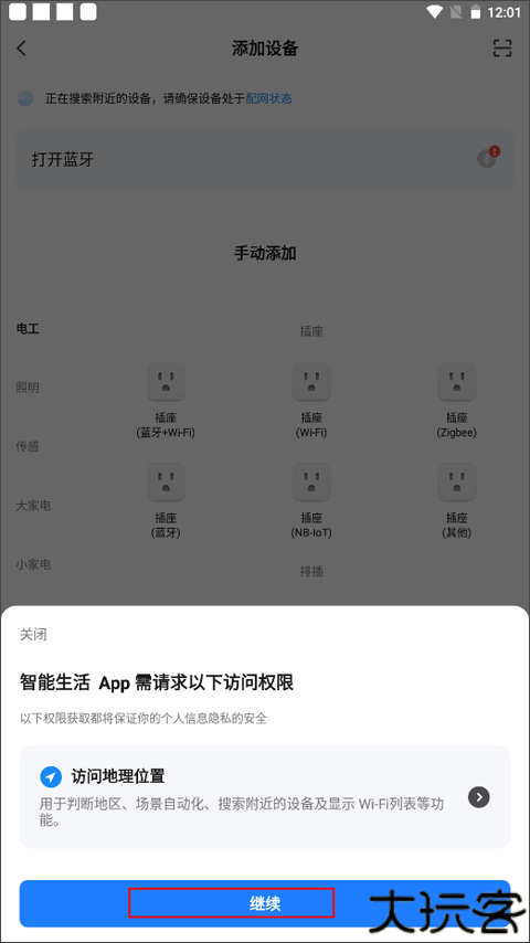 弹窗提示授权请求,点击继续并逐一授予所需权限。