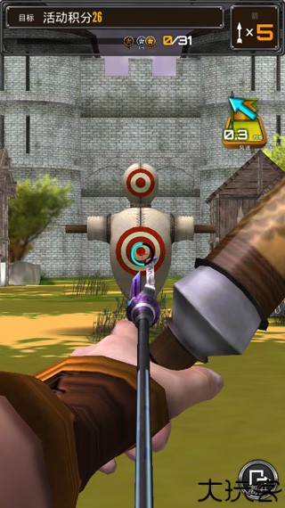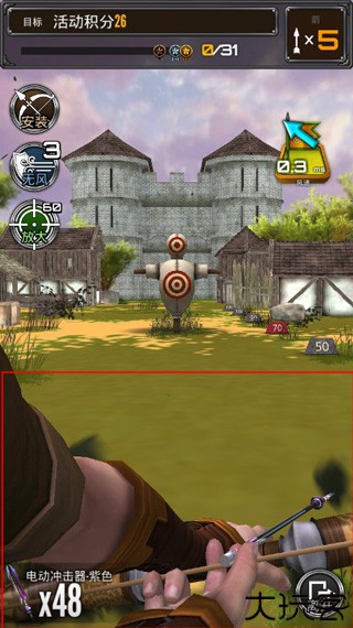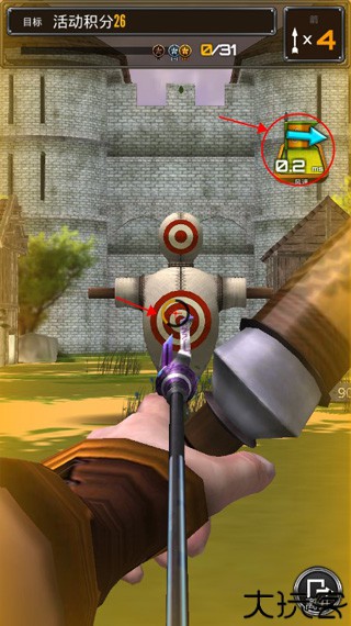 1、长按红框内拉弓,松手射箭,瞄准目标完成精准打击。