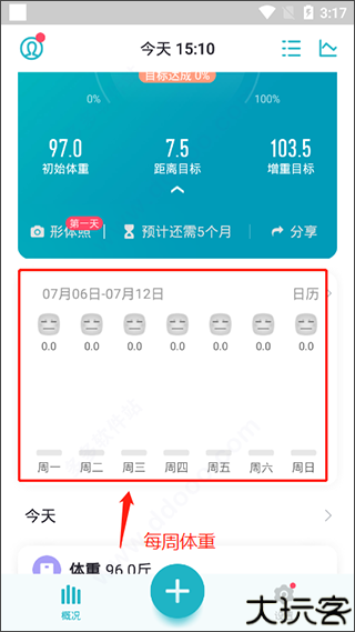 左右滑动查看周体重趋势,点击图表可补充或修改数据。