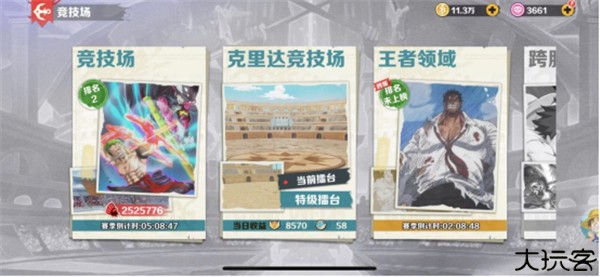 5、历练,是获得金币、经验值和突破剂的主要途径,主要分成危险的因佩尔监狱、休闲的龙宫城和充满激情的四皇挑战等。