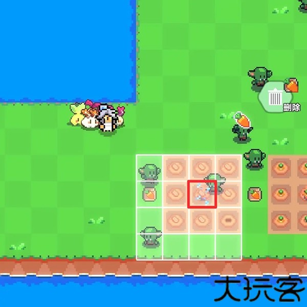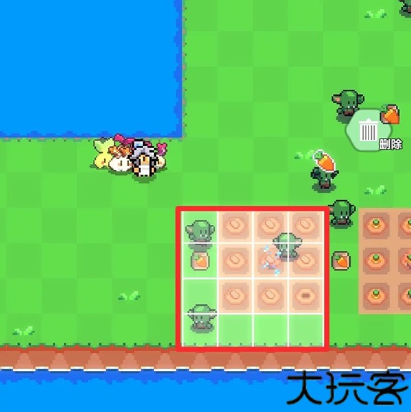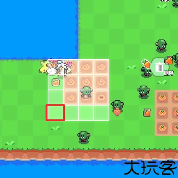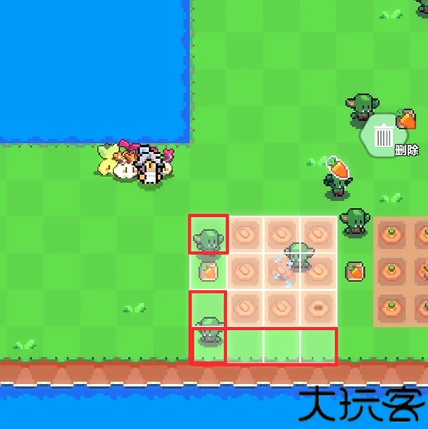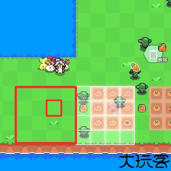 5、假设要将农作物移动到图中红色大方块区域,则洒水器应该处于红色小方块区域。