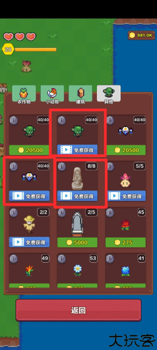 1、上线先把下方第三个(钻石图标)里其他内的三个看广告点满:a精灵(苦力)b飞行器(只捡掉落物)c神像(送新的物种立马凑钱放出来)。精灵最重要的,可以种地可以浇水可以捡物品(5个),飞行器一次一个。