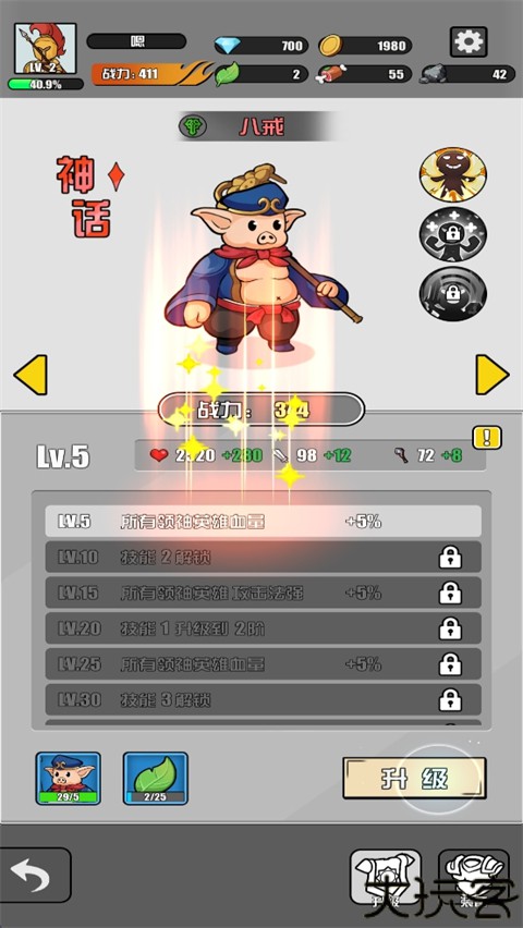 7、英雄的等级越高,提升的战斗力也越高。玩家应优先考虑将手中的所有英雄都进行升级操作。