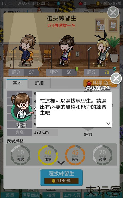 2、挑选优秀的练习生,培养偶像团队,并为他们设定角色如主唱、舞者等。