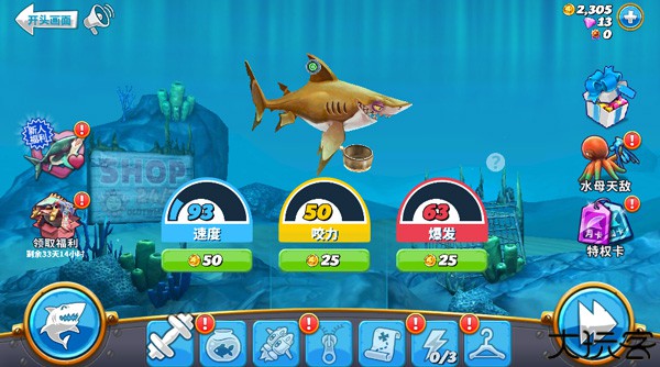 2、积分条满了(进行游戏就能获得积分)之后解锁该型号的鲨鱼,然后在使用金币购买。