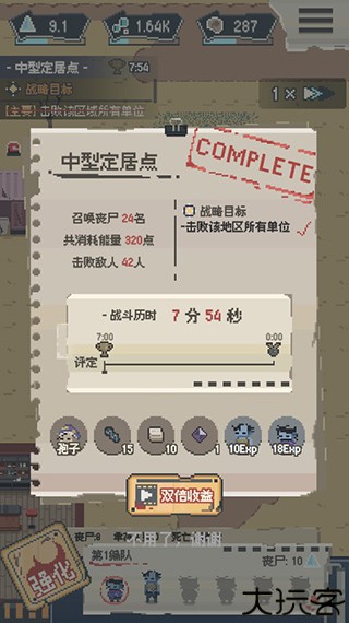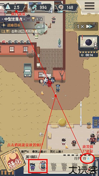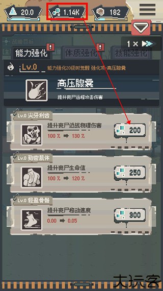 玩家可以点击下方强化图标,使用蓝色能量,强化僵尸,提高它们的伤害、生命值、移动速度。