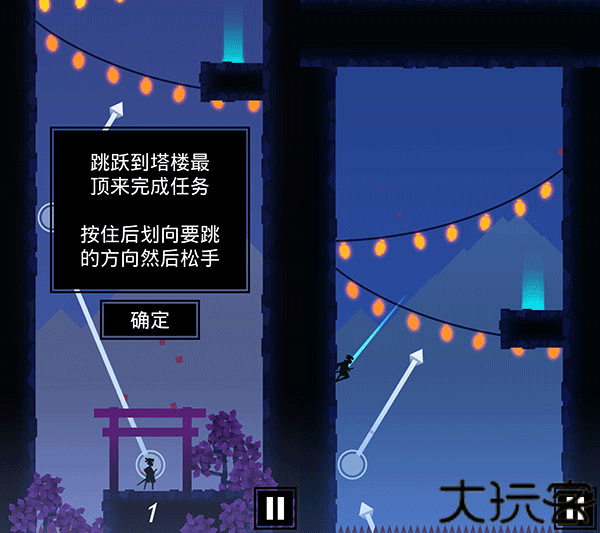 1、玩家按住屏幕后,再划向要跳的方向,然后松手,忍者即可朝着该方向冲刺。