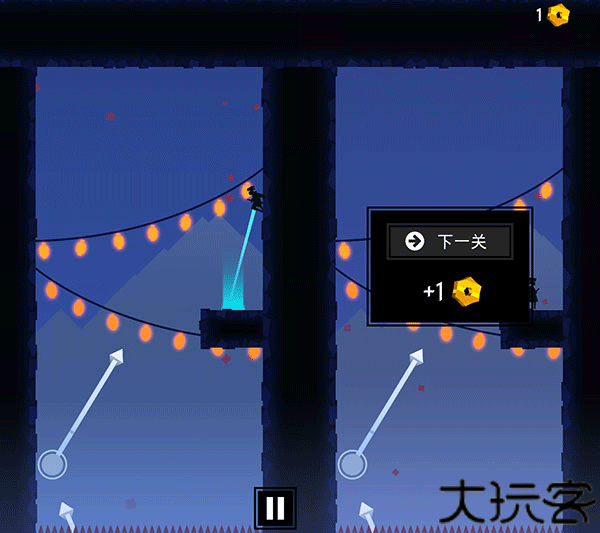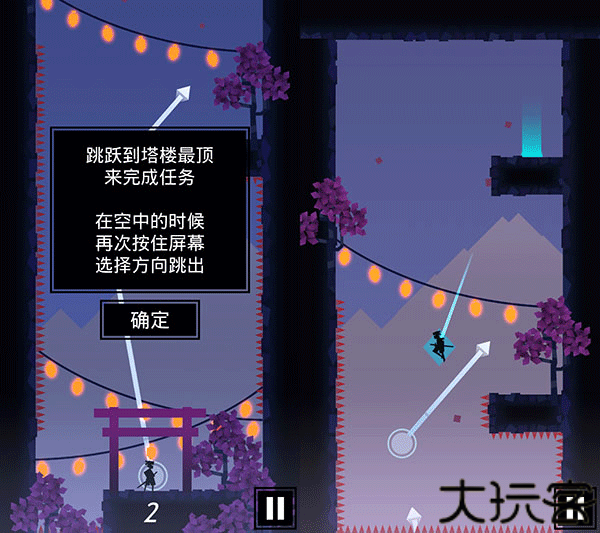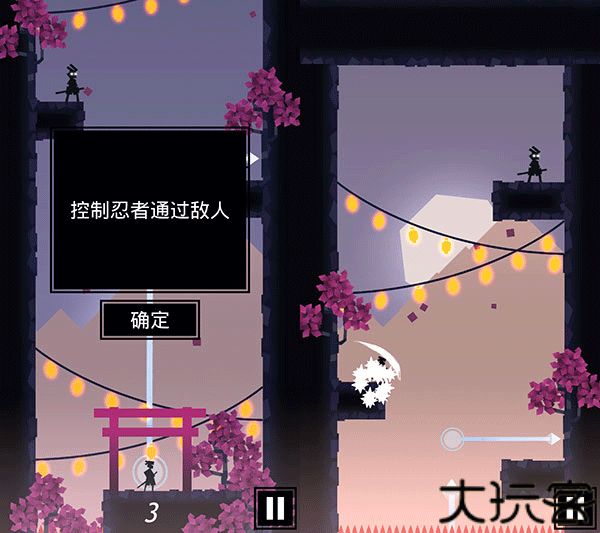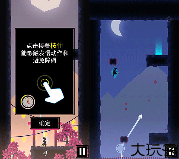 2、在空中的时候,再次按住屏幕,然后忍者就可以再次选择方向跳出,相当于是多段跳跃。