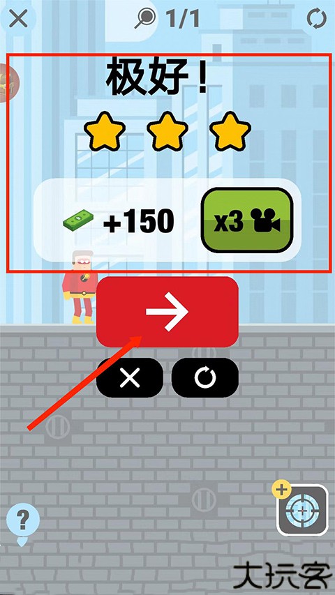 5、敌人被击飞后,顺利通关,获得评分和奖励,选择“下一关”继续游戏。
