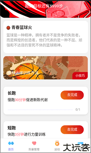 1、首先进入首页可以进行运动打卡和篮球训练。
