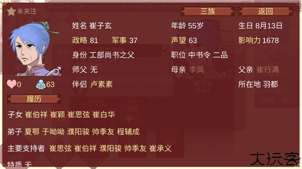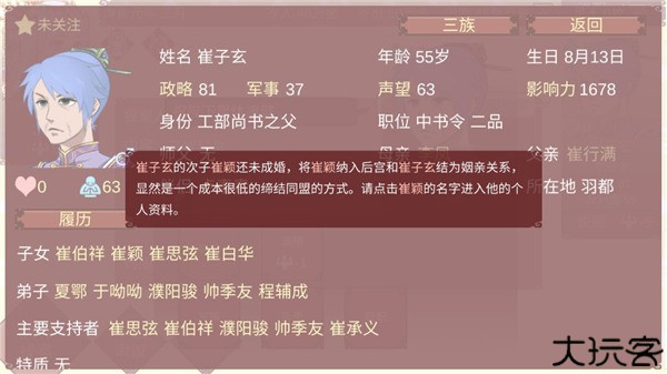 14、这里可以看到崔子玄的次子崔颖还未成婚,将崔颖纳入后宫和崔子玄结为姻亲关系,显然是一个成本很低的缔结同盟的方式。请点击崔颖的名字进入他的个人资料。