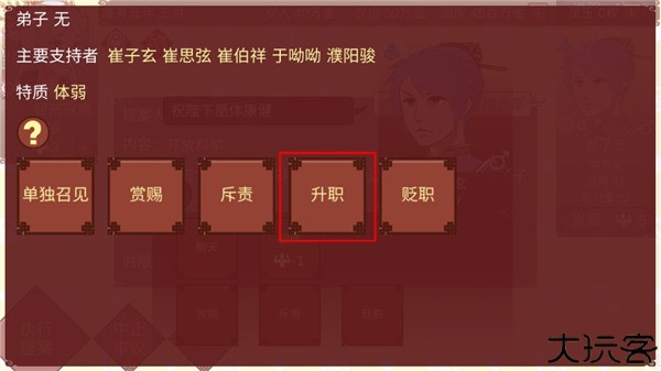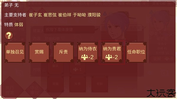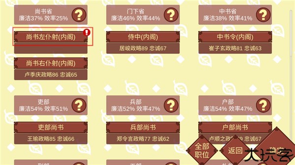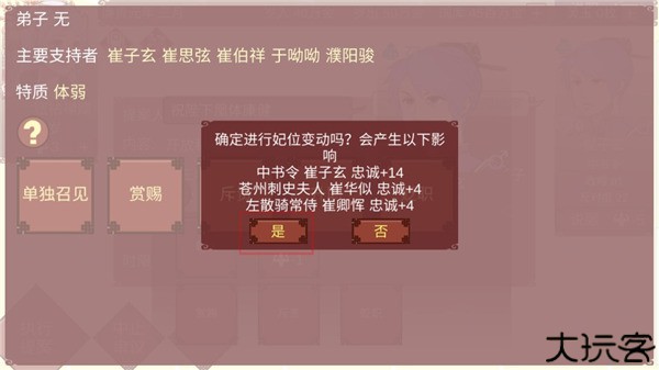 18、确定进行妃位变动吗?会产生以下影响中书令崔子玄忠诚+14乐苍州刺史夫人崔华似忠诚+4 g左散骑常侍崔卿恽忠诚+4,点击是。