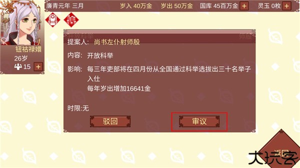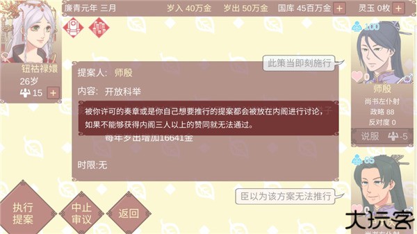 10、被玩家许可的奏章或是自己想要推行的提案都会被放在内阁进行讨论,如果不能够获得内阁三人以上的赞同就无法通过。