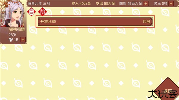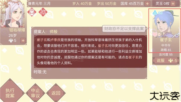 12、崔子玄和卢季庆是世族的领袖,开放科举意味着挤压世族子弟的入仕机会,想要说服他们并不容易。相对来说,崔子玄对玩家更加信任,愿意合作的姿态也表现的更加明显一些。如果能够和他进行一些利益交换增加他对你的忠诚度,说服他通过玩家的提案还是有可能的。请点击崔子玄的头像观看他的个人资料。