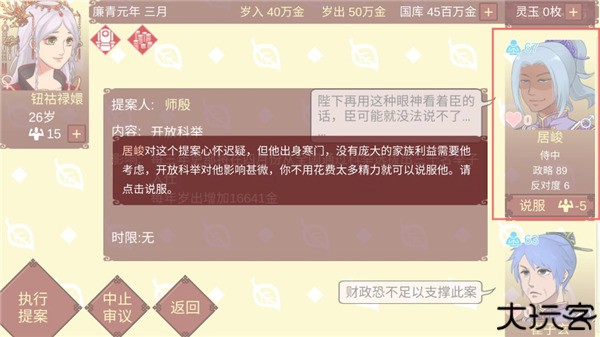 11、居峻对这个提案心怀迟疑,但他出身寒门,没有庞大的家族利益需要他考虑,开放科举对他影响甚微,不用花费太多精力就可以说服他。请点击说服。