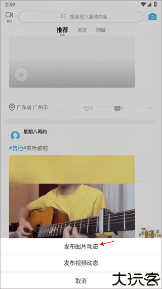 下方弹窗选择发布“图片”或“视频”动态,任选其一操作。