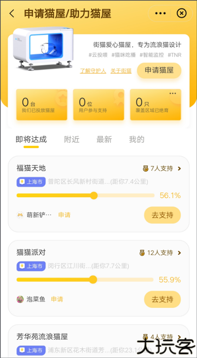 在申请/助力板块,为流浪猫申请庇护或捐赠猫粮。