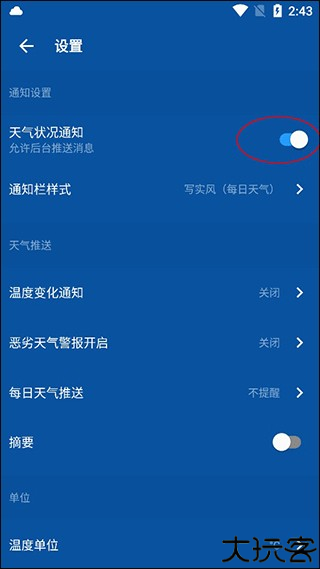 找到天气推送开关,将其关闭即可停止状态栏消息提醒。