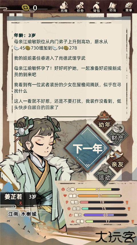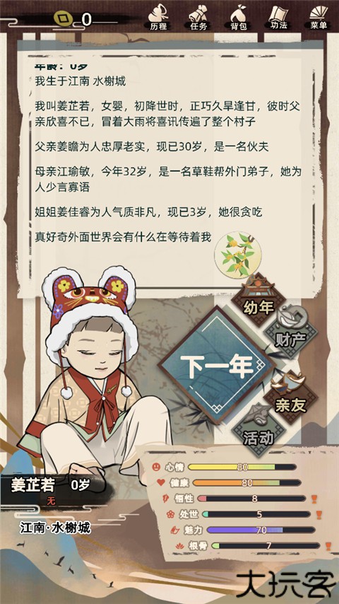 2、游戏生成幼年状态后,点击下一年即可查看未来事件。