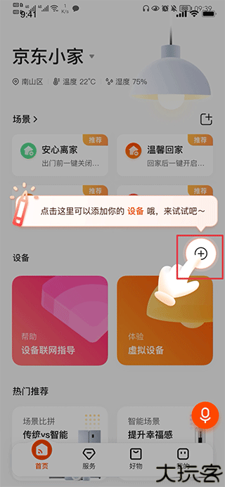 1、启动京东小家APP,在首页点击右上角“+”号开启设备添加流程。