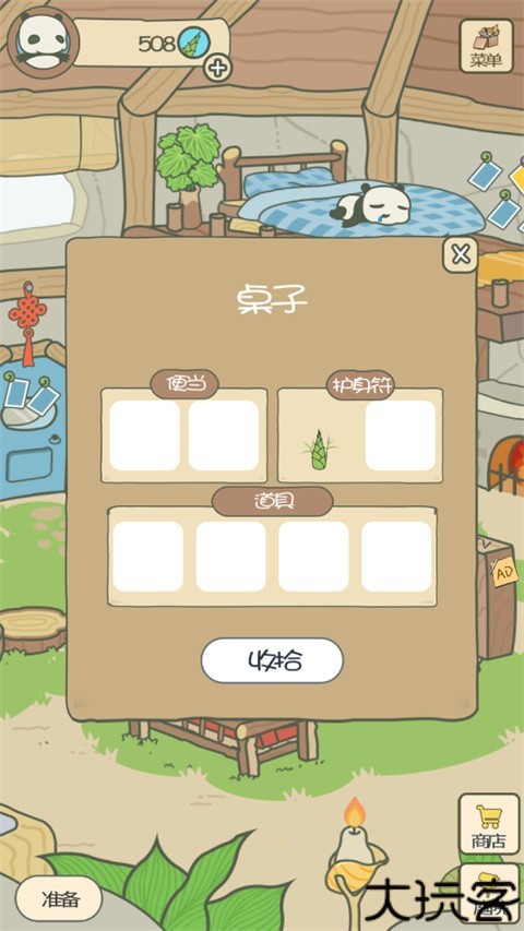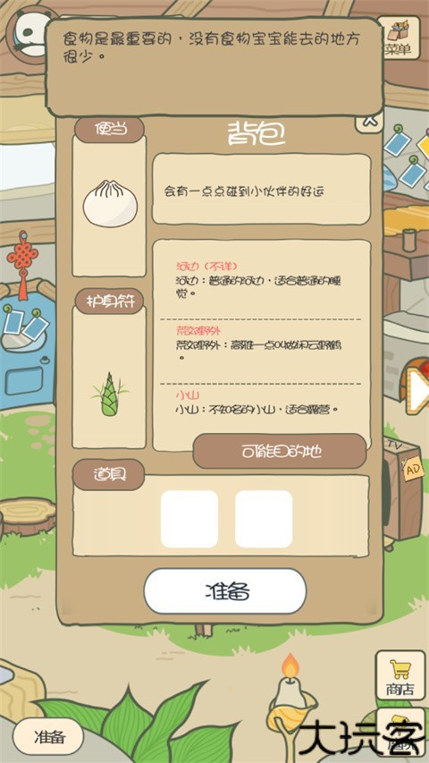 2、行李筹备:在“背包”界面为熊猫搭配旅行物品,不同食物影响旅行时长,护身符提升遇见稀有风景的概率。