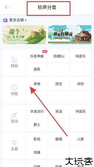 2、铃声分类页面里找到来电分类点击进入对应铃声列表,查看来电铃声资源。
