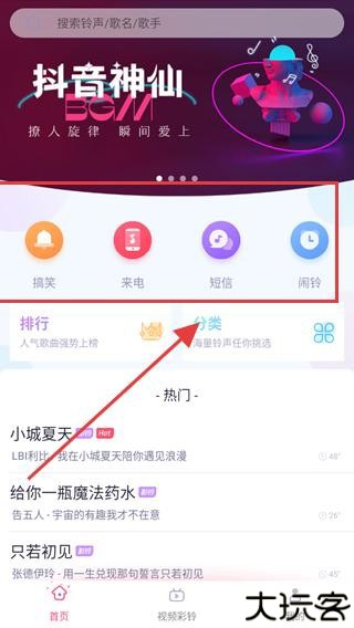1、进入酷音铃声app手机版首页,点击分类按钮来去选择铃声类别。