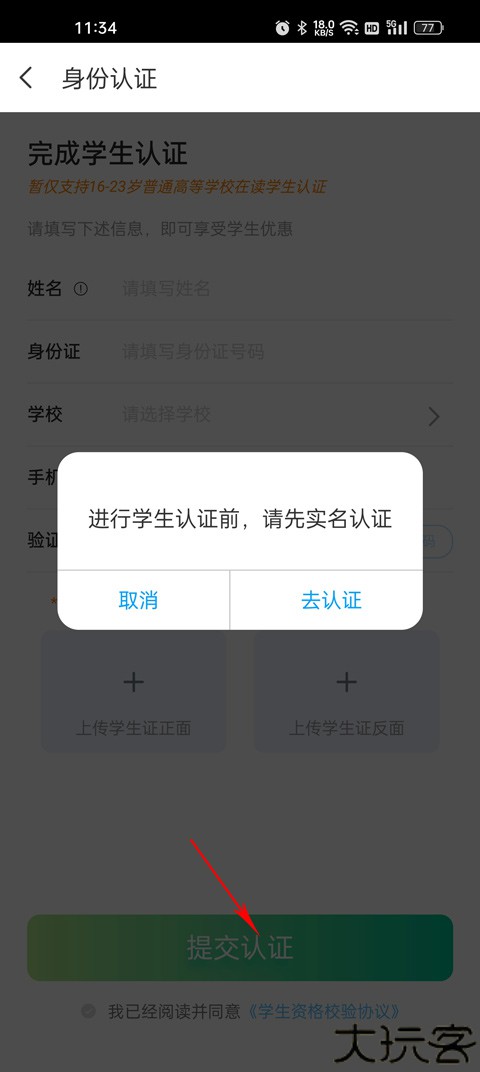 6、输入姓名、身份证号、院校信息及验证码后提交。