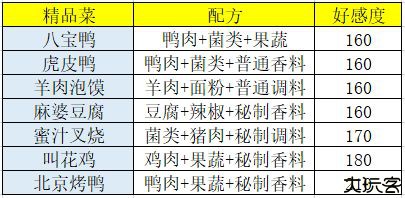 当然凡事也有例外,其一是蜜汁叉烧,增加170好感度,但是消耗元宝为90。它比同样消耗90元宝的叫花鸡少了10点好感度。其二则是我们的北京烤鸭,为增加210好感度,消耗110元宝。它按着正常算法应该是增加220好感度的。