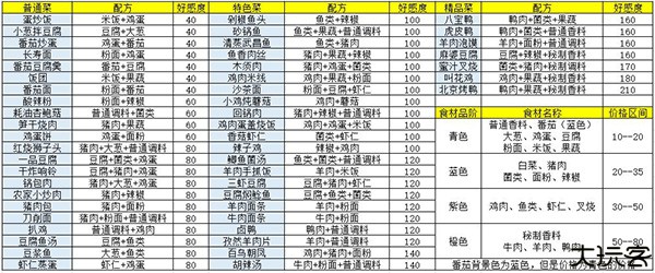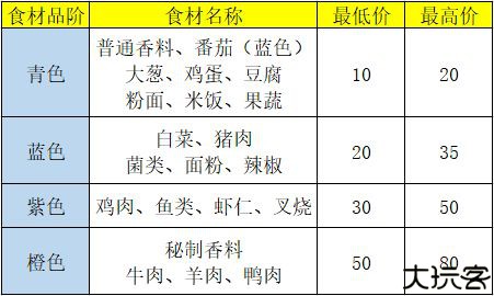目前一共有21种食材,按照食材的背景颜色来进行区分品阶,可分为青色,蓝色,紫色和橙色。其中橙色的出现率较低,大家如果看见橙色食材,又刚好价格合理就直接入手啦,不要犹豫!