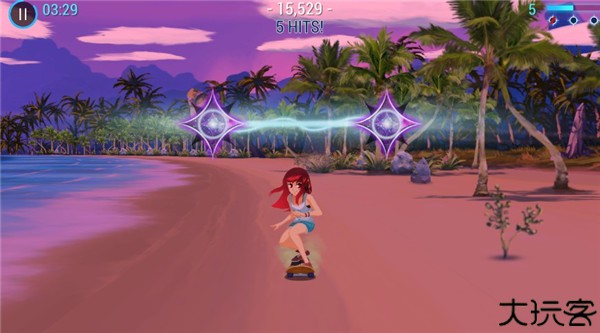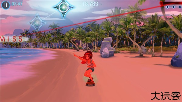 3、游戏巧妙融合滑板跑酷和节奏点击为主要玩法,玩家在奔跑中点击音乐旋律,获得沉浸式叙事体验。
