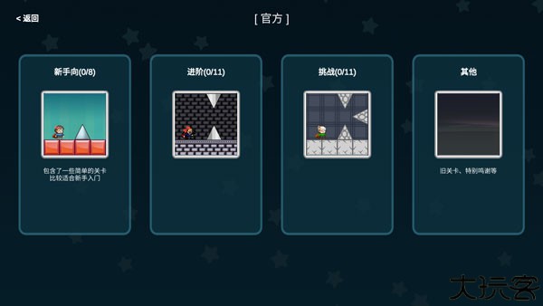 官方目前提供31个关卡,其中包括教程、跳刺、解谜、特殊玩法等多种类型,还有挑战性十足的Boss战、探索关卡和世界关卡(内含36个小关卡)。