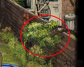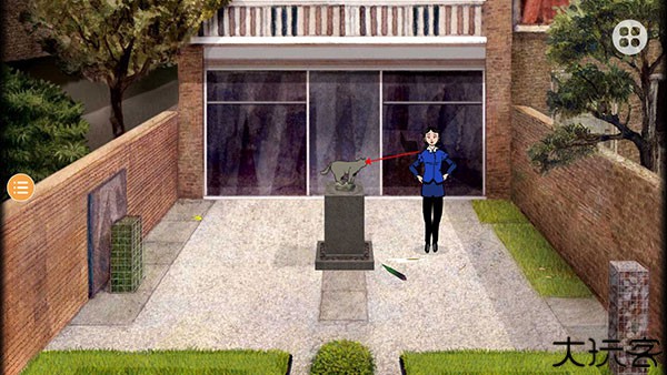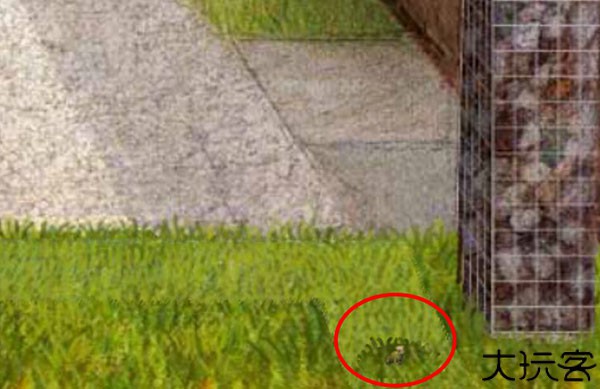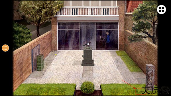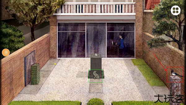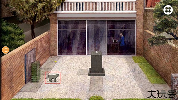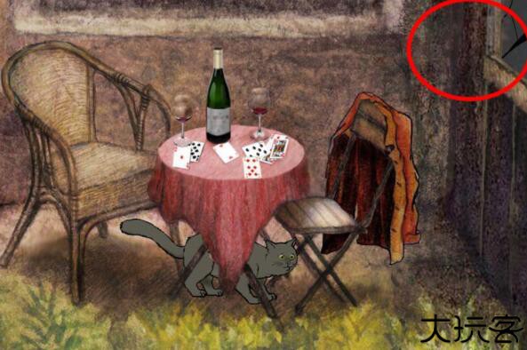 点击庭院的桌子放大,如图,点击右侧玻璃,再点击Milo,Milo进入小屋子。
