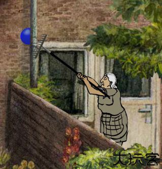 首先点击直升机,将喜鹊吓到树枝上,再点击蹦床上的男孩三次,将喜鹊吓回屋顶,此时,围墙右侧老妇人的目光会跟随喜鹊移动,当老妇人看向屋顶时,迅速点击老妇人,将柱子上的蓝球弄下来。