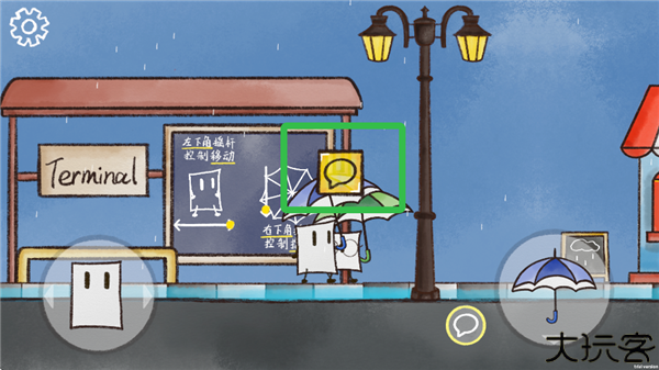 3、站在绿伞人物旁点击对话按钮触发情节推进。