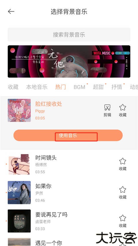 点选添加音乐按钮,挑选喜好曲目插入视频。