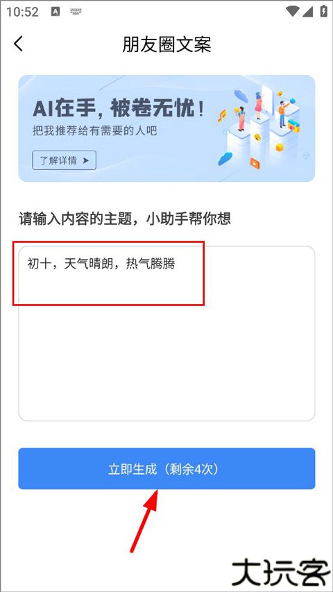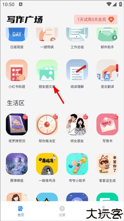 首页点击“朋友圈文案”图标,进入创作模块界面。