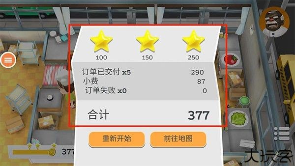 8、当玩家完成所有订单后,可看到自己所获得的星星、订单和小费的收益。