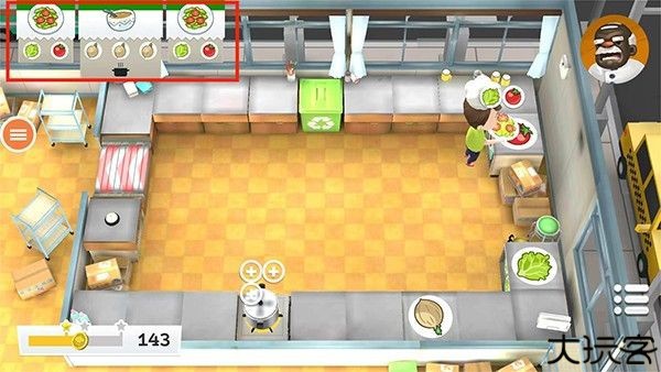 3、当玩家开始烹饪,可看到左上角的订单,玩家需根据订单需求做出对应料理,玩家首先点击以领取沙拉。
