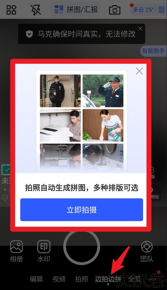 3、边拍边拼功能支持自动拼图排版,适合多图场景记录拍摄,点击“立即拍摄”即可操作。