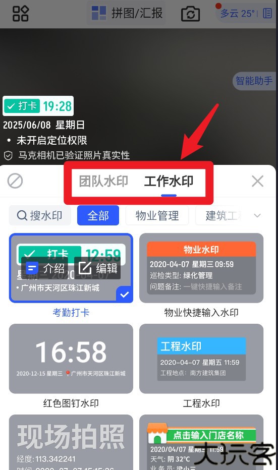 2、水印选择界面可在“团队水印”与“工作水印”之间切换,适用于考勤、工程及物业拍照需求。