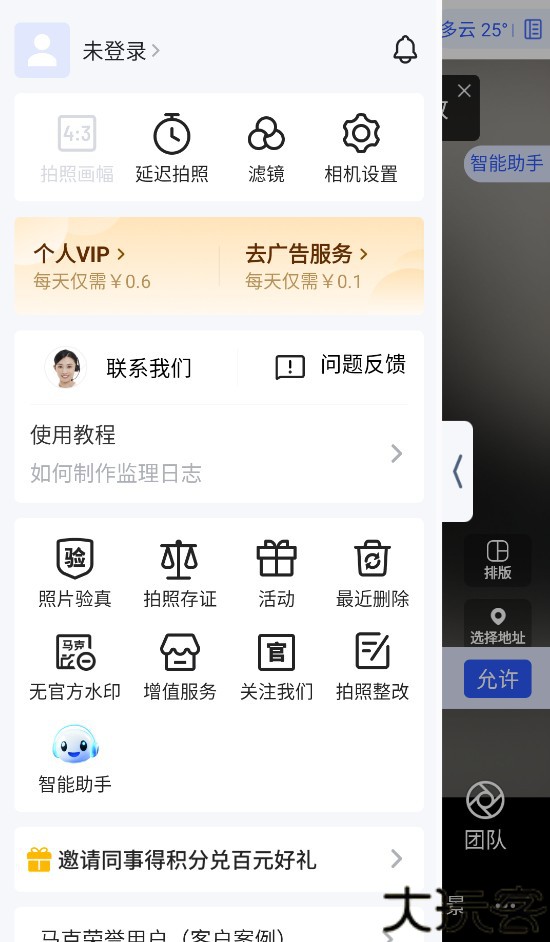 5、侧边栏菜单集合:拍照验证、无官方水印、去广告服务等功能,允许设置相机及管理VIP特权。