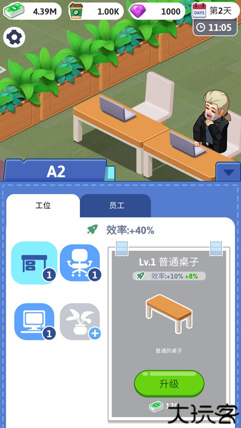 3、通过点击工位,玩家可升级桌子、椅子、电脑、盆栽等各种装饰,以此提升员工的工作效率。