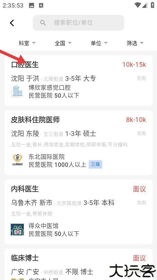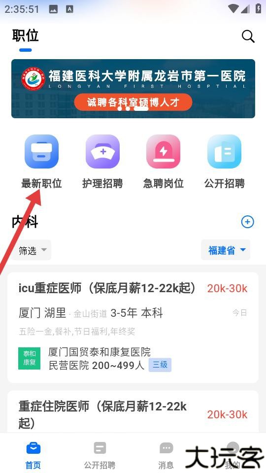 进入平台首页,点击最新招聘板块,可见各地医院科室岗位及薪资要求。