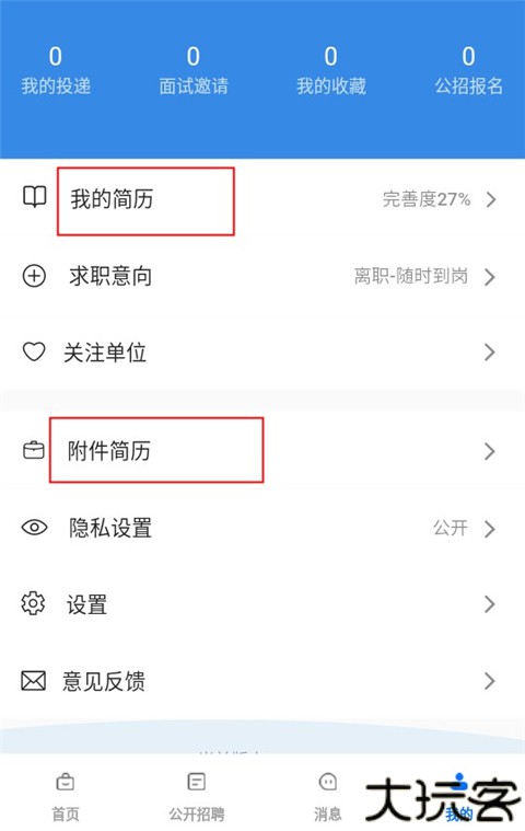 在“我的”页面进一步补充或上传附件简历以提升竞争力。