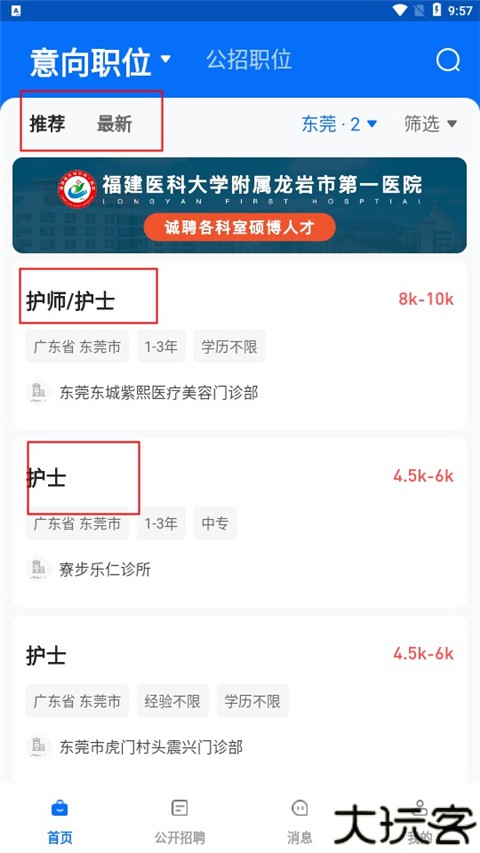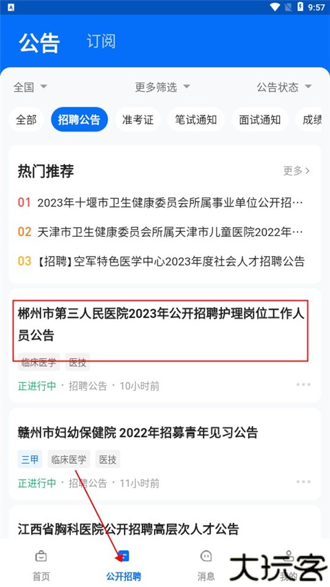 在公告区可查看各大医院公开招聘信息与条件说明。