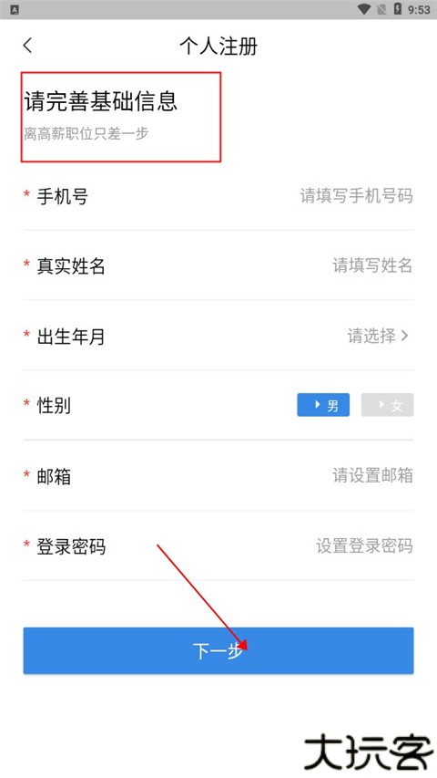 录入姓名及基础资料后继续填写求职方向与学历条件。