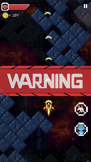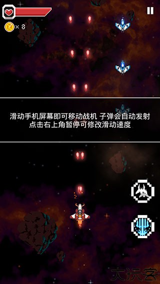 2、滑动手机屏幕即可移动战机位置,子弹会自动从战机发射,点击右上角的暂停键可修改滑动幅度。