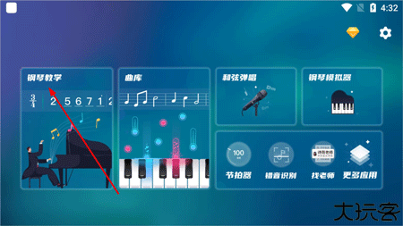1、打开来音钢琴app,在软件的首页有钢琴教学、曲库、和弦弹唱等栏目,点击钢琴教学即可开始学习。