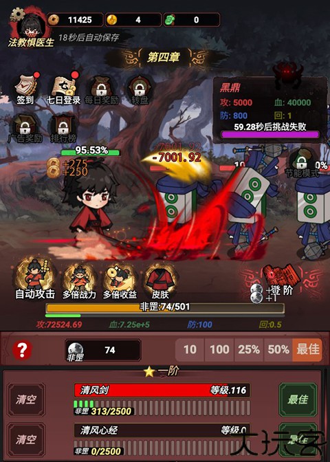 4、有自动挂机、多倍战力、多倍收益三个额外buff可以解锁,需要玩家观看广告解锁。